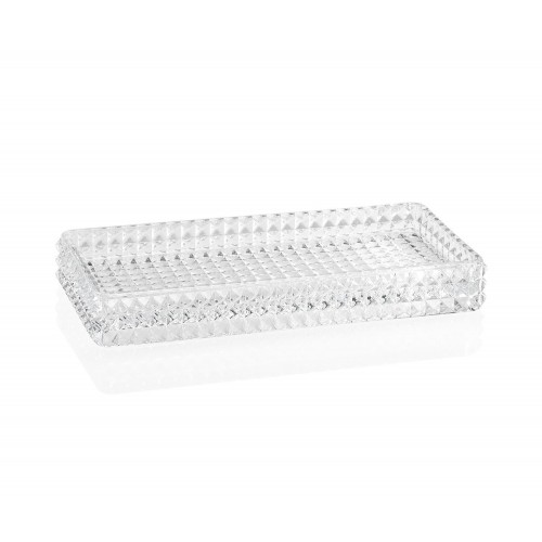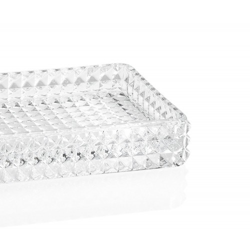 Esta bandeja de vidrio con relieve efecto diamante forma parte de un conjunto de baño de dos piezas, compuesto por un dispensador y una bandeja rectangular. Tiene forma rectangular y puede utilizarse como jabonera o como bandeja para dejar joyas u otras cosas pequeñas de baño. Es de estilo Glam, que se caracteriza por aportar lujo, elegancia y sofisticación.