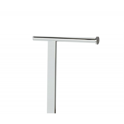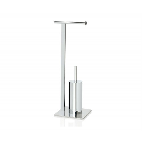 Este portarollos de baño con escobilla de wc incorporada tiene una estructura de metal cromado y acabado brillante con base rectangular cuadrada. El soporte de papel higiénico en forma de T
