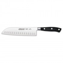Cuchillo santoku profesional de 180 mm de la Serie Riviera de la marca Arcos. Gracias a su filo con alveolos evita que los alimentos se queden pegados al cuchillo al realizar el corte. El cuchillo santoku es la herramienta multiusos de la cocina asiática de hoja ancha y muy afilada. Tiene tres utilidades: preparación de carne, pescado y verdura. En la serie Riviera se combina la sutileza de las