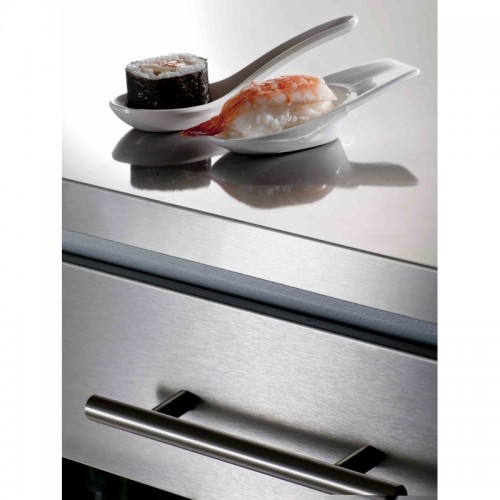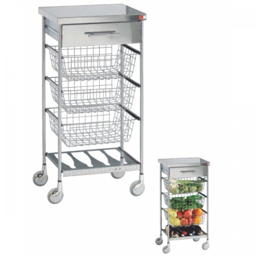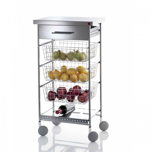 Verdulero AFINITY INOX Mobiliario Auxiliar de Cocina Verdulero 3 cestas con cajón, ruedas diseño,cajòn y tapa acero inoxidable * Armazòn color acero inoxidable * Tres cestas de gran capacidad totalmente extraibles * Botellero inferior.Admite botellas de Cava. * Tapa superior , frontal del cajòn y tirador, en Acero Inoxidable con tratamiento anti-huellas (Easy Clean) * Ruedas giratorias