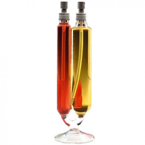 Aceitera y vinagrera doble spray realizada artesanalmente en vidrio PYREX soplado a boca. Aceitera: 140 ml. Vinagrera: 70ml. Altura: 260 mm. Ancho: 85 mm. Marca: Garuti Referencia: V-208
