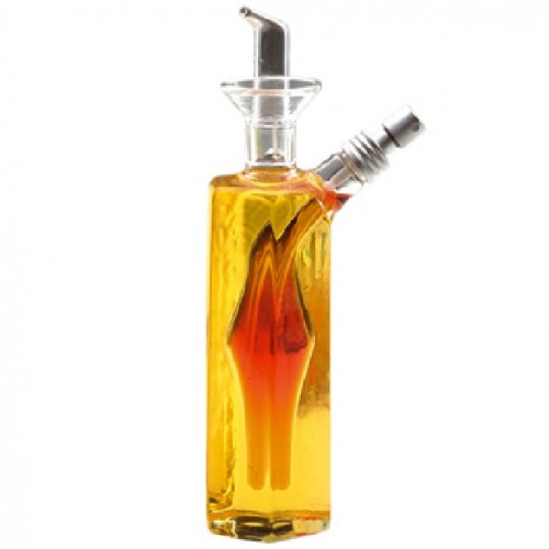Aceitera y vinagrera mixta realizada artesanalmente en vidrio PYREX soplado a boca con dosificador en spray para el vinagre. Capacidad vinagrera: 70ml. Capacidad aceitera: 240ml. Altura: 260 mm. Ancho: 85 mm. Marca: Garuti