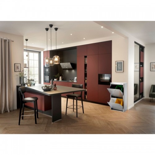 Mueble de reciclaje en acero inoxidable con embellecedores y 4 compartimentos que identifican cada residuo (orgánico, plásticos, vidrio y papel) con un color diferente que facilitará la tarea de separarlos.Medidas: 52x96,5x27,5 (ancho/alto/fondo) cm.