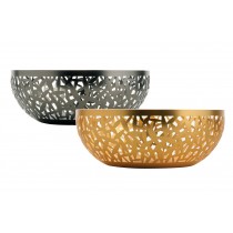 Frutero perforado en acero, dorado y grey metal. diseñado por Marta Sansoni, CSA. DIMENSIONES: H 10.8CM Y 29CM