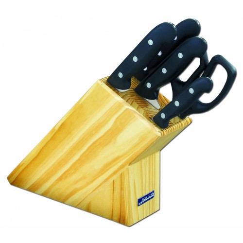 Taco de madera con 4 cuchillos de la serie doméstica Maitre y un tijera de cocina de la marca Arcos. Está compuesto por: 1 cuchillo de verduras doméstico de 105 mm.El cuchillo de verduras es un cuchillo pequeño, de hoja fuerte, filo liso y punta estable. Limpia, pela y corta pequeñas frutas y verduras. 1 cuchillo cocinero doméstico de 215 mm.El cuchillo cocinero es un cuchillo de hoja ancha