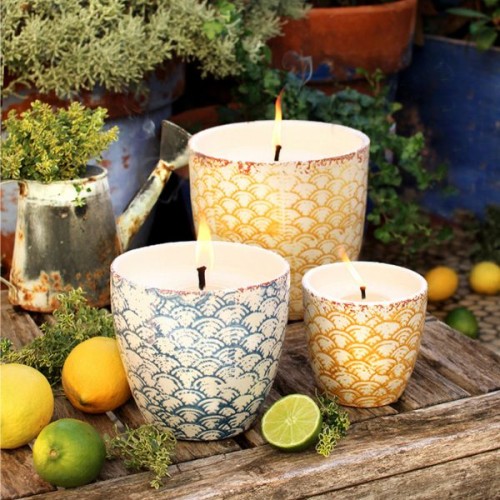 Squamis nos invita a surcar el mar mediterráneo con una colección de velas de exterior en maceta de terracota con un estampado inspirado en las escamas de un pez, un diseño creado a mano en cada una de las piezas.  Disponible en tres colores y tres tamaños diferentes. Efecto antimosquitos.